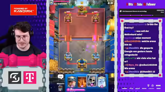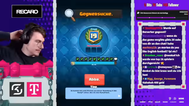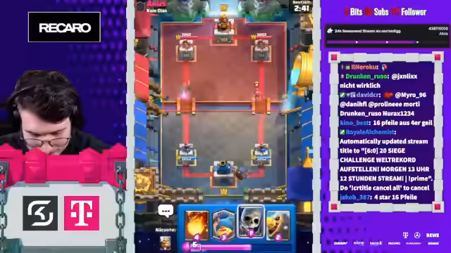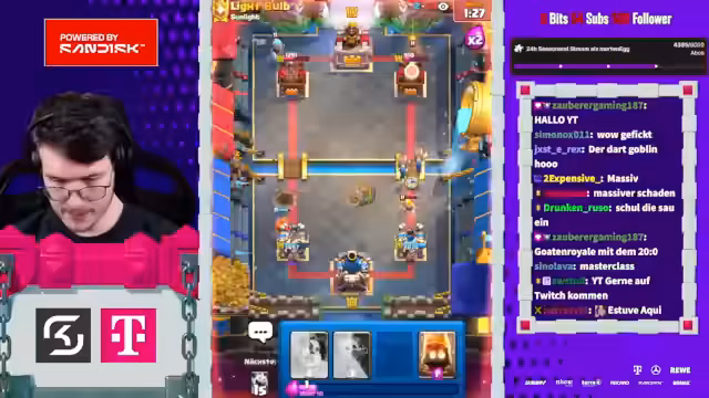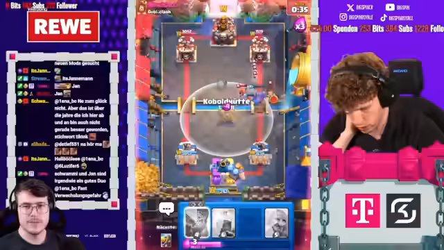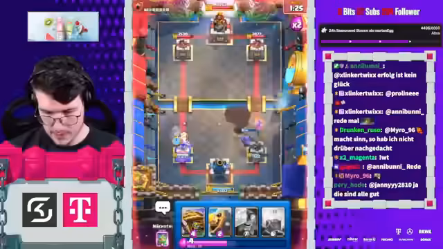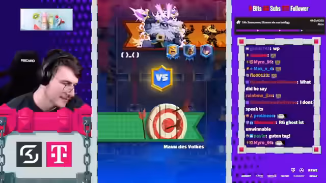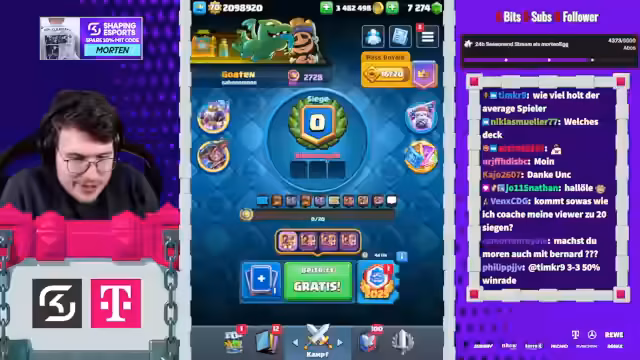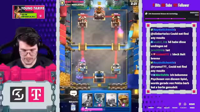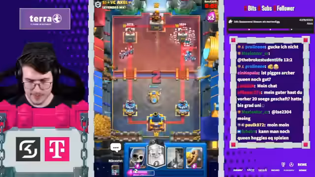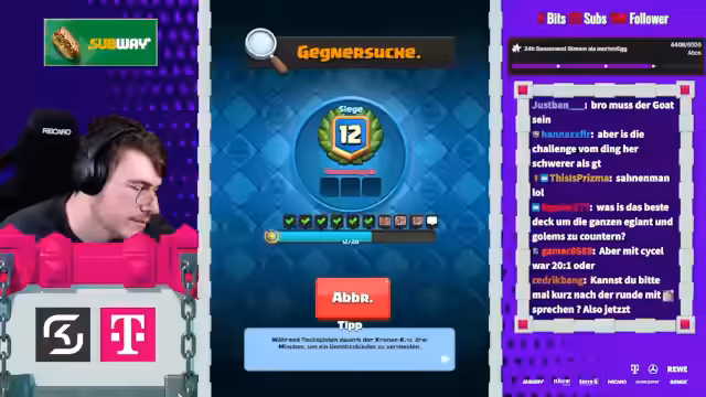 05:27:50Der Stream beginnt mit der Erwähnung von Spielstrategien im Clash Royale, wie dem Einsatz von Evo-Cycle und Bowler, um den Gegner anzufassen. Ein aktuelles Spiel gegen einen Spieler namens Mo wird als aggressiv beschrieben, das trotz Damage am Ende als gewonnen eingestuft wird. Der Streamer berichtet über den aktuellen Stand in der 20-Siege-Challenge und erwähnt, dass er auf einen Account mit einer 20-0 Bilanz abzielt. Dabei wird einiges über die Deck-Komposition und die Vorlieben des Gegners gesprochen, wie das Spielen von 'Chopped Ankh'.
