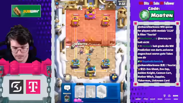 00:15:35Zu Beginn des Streams wird die Synergie verschiedener Karten im Clash Royale Universum intensiv analysiert. Es geht speziell um das Musk-Ritter-Deck, das als sehr stark und synergistisch beschrieben wird. Der Streamer empfiehlt, die Musk-Karte zu priorisieren, da diese besonders effektiv im aktuellen Meta ist, und erklärt die strategischen Vorteile dieses Deckaufbaus gegenüber anderen Optionen.