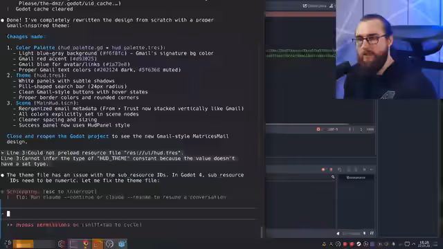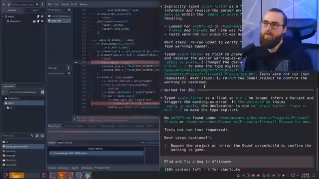 01:27:03Ein Hauptproblem während des Streams waren wiederholte technische Fehler und Probleme mit dem Design-System. Der Streamer kämpfte mit dem 'Theme' in Godot, das nach unten vererbt wird, was zu fehlenden und inkonsistenten Darstellungen führte. Er stellte fest, dass KIs wie Codex derzeit furchtbare Designs erstellen, was die visuelle Entwicklung stark behindert. Die KI schien sich in der Handhabung von Themes und Layouts zu verlieren, was zu einem 'ekeligen' und unprofessionellen Erscheinungsbild führte.