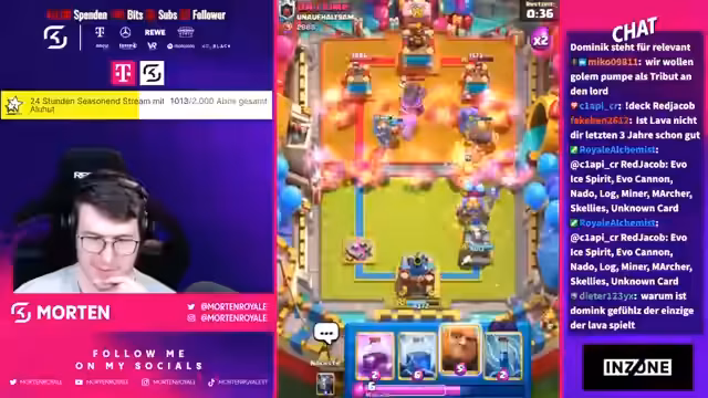 03:02:33Es wird über verschiedene Decks und Matchups diskutiert, darunter Lava-Goat gegen Lava-Möhrer, sowie über die Spielweise von Psy-Schosen. Es wird die Frage aufgeworfen, was man spielen sollte, wenn Lava komplett tot wäre, und die Dominanz von Executioner (Exi) in der Vergangenheit angesprochen. Die Aja-Spieler werden für ihre riskante Spielweise kritisiert. Der Streamer äußert sich selbstironisch als Lava-Goat und lobt seine Back-to-Back-Siege mit Lava-Möhrer. Er kündigt an, dem Lava-Mann im Call Konkurrenz zu machen. Es wird über die Sinnhaftigkeit von Inferno-Türmen diskutiert und festgestellt, dass das Matchup dadurch schwierig wird. Der Chat wird für sein Verhalten kritisiert, aber auch der Bron wird gelobt. Der Streamer äußert Frustration über die lange Live-Dauer und die Notwendigkeit einer Einweisung. Erwähnt wird, dass er als Lava Goat bezeichnet wird, was seinen Spielstil beschreibt.