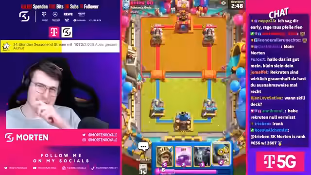 03:13:04Es werden verschiedene Spielsituationen analysiert, darunter der Einsatz von Feuerbällen und die Bedeutung von Aura-Games. Der Streamer erreicht mit seinem Spielstand 2.7, was als verrückt bezeichnet wird. Es wird diskutiert, warum Morty Boy kein Labern auf das Starting End hat und wie sich dies auf das Spiel auswirkt. Der Streamer äußert den Wunsch, in die Top 200 zu kommen. Es wird die Frage aufgeworfen, ob eine bestimmte Karte in jedem Deck gespielt werden sollte. Der Streamer gibt an, dass er überrascht war, dass er instant gefailt wurde. Es wird überlegt, warum kein Spooky mehr gespielt wird. Der Streamer äußert sich begeistert über das Spiel und die erreichten Komponenten. Es wird festgestellt, dass Dominik die Massen spaltet und man nicht jedem gefallen kann. Der Gegner spielt das gleiche Deck, aber mit Pfeilen, was als nicht so geil empfunden wird. Es wird überlegt, ob etwas abgequackt wurde und ob es sich um einen Miner handelt. Der Streamer gibt an, dass er als Lava-Wonstick bekannt ist und dass sich dies schnell herumgesprochen hat. Es wird überlegt, welche Karten der Gegner hat und wie man am besten vorgeht.