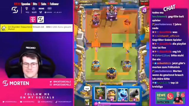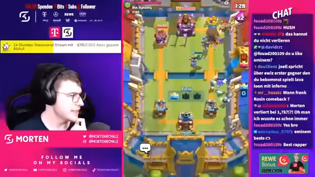 01:45:34Der Streamer spielt gegen Razer und analysiert dessen Deck, welches Ähnlichkeiten zum eigenen aufweist. Es wird überlegt, ob es sich um einen Snipe handelt. Der Streamer begrüßt Thomas im Chat, der von Anni aus dem Keller gelassen wurde. Es wird über ein früheres 1v1-Duell gesprochen, bei dem der Streamer gegen den 'King of the Limer' verloren hat. Das aktuelle Golem-Deck wird vorgestellt. Es wird über Sniper diskutiert und festgestellt, dass diese oft Franzosen sind. Der Streamer spielt Grab und wundert sich über zehn Karten im gegnerischen Deck. Es wird sich über eine Erwähnung im YouTube-Video gefreut. Es wird über die Größe des Stuhls im Verhältnis zum Streamer gescherzt. Der Streamer reagiert auf Kommentare im Chat, darunter von Tommi und Dominik, und diskutiert über Mega-Counts und Zodiacs Links. Es wird über ausgewählte Karten diskutiert und spekuliert, ob Prinz bei Supercell arbeitet. Der Streamer spielt Golem und wird von Faust gesniped, was zu Freude führt.