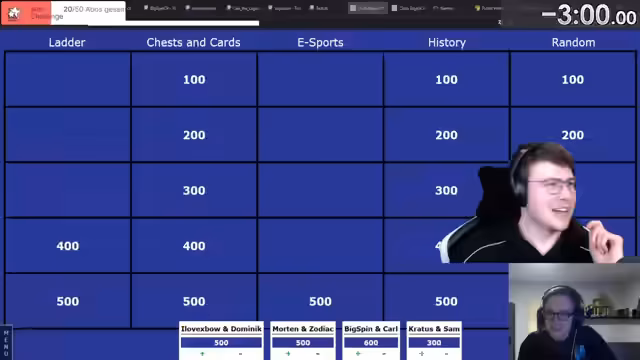 02:19:58Es wird überlegt, eine Frage aus der Kategorie Chests and Cards zu wählen. Die Entscheidung fällt auf eine 500er-Frage: Wie heißt die Fähigkeit des Goldenen Ritters? Es wird überlegt, einen Tipp zu nehmen. Der Tipp lautet, dass die Fähigkeit im Englischen aus zwei Wörtern besteht, die mit demselben Buchstaben beginnen. Royal Rush wird als Antwort vorgeschlagen, aber verworfen. Die korrekte Antwort ist Dashing Dash. Im Anschluss wird eine 300er-Frage aus der Kategorie Chests and Cards gewählt: Wie viel Kapazität hat man von den gewöhnlichen Jokern bei Königsturm Level 11? Es werden verschiedene Antworten genannt, die sich an den Kapazitäten höherer Level orientieren. Die korrekte Antwort ist 2000. Es wird eine 500er-Frage aus der Kategorie History gewählt: Welcher Clan hat zuerst die 5000 Clan-Kriegstrophäen erreicht? Es werden verschiedene Clans genannt, darunter Clan Pejo, Schokalas und Master Forces. Die korrekte Antwort ist World X Union 2. Abschließend wird eine 500er-Frage aus der Kategorie Achievements gewählt: Wie viele Karten musste man für Stufe 3 des Achievement Tournament Rewards gewinnen? Es wird spekuliert und gepokert. Die korrekte Antwort ist 100k.