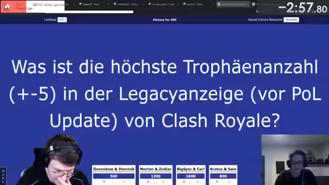 02:43:08In dieser Quizshow-Runde geht es um Achievements und Schätzungen im Spiel. Zunächst wird über die Sicherheit einer Schätzung von 100.000 diskutiert, wobei Unsicherheit herrscht und schließlich 10.000 vorgeschlagen werden. Es wird die maximale Stufe bei Achievements thematisiert, wobei Stufe 3 als höchste Stufe in Erinnerung ist. Die Frage nach der Anzahl benötigter Karten wird aufgeworfen, wobei die Antwort von 500.000 Karten im Raum steht. Es folgt eine Diskussion über frühere Fehleinschätzungen und das Auslachen anderer Teilnehmer. Abschließend werden Punkte verteilt und über den Einsatz des Jokers bei einer bevorstehenden Frage nachgedacht, wobei History 100 als sichere Option in Betracht gezogen wird. Es wird kurz diskutiert, welche Antwort Morten und Zodiac gegeben hätten, bevor die Frage zu History 100 gestellt wird: An welchem Datum wurde Clash Royale global veröffentlicht?