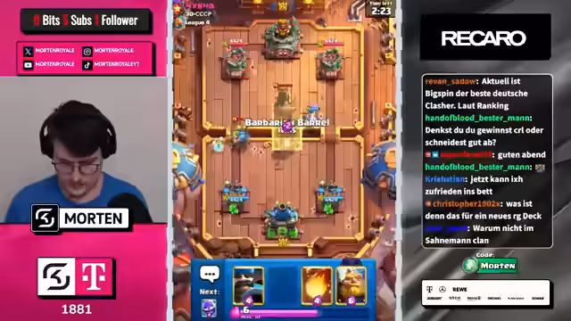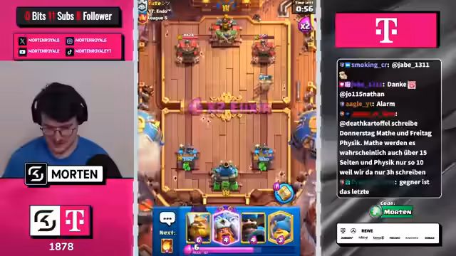 01:18:21Das Gameplay wechselt zu einem neuen Deck, dem ein neues 'Anlock' (ein seltener Leaderboard-Punkt) hinzugefügt wurde. Der Streamer zeigt sich nervös über den neuen Versuch. Es wird betont, dass das Spielstil von Clash Royale nur funktioniert, wenn man das Meta-Deck 'Holz uppuscht'. Gelegentliche Niederlagen werden hingenommen, da das Spiel im Moment sowieso 'beschissen' sei. Der Fokus liegt auf dem Testen und Adaptieren verschiediger Karten im Deck.