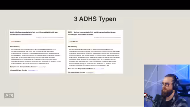 01:33:23Die Diagnose von ADHS ist ein komplexes und anstrengendes Unterfangen. Die Symptome können sich sehr unterschiedlich äußern und überschneiden sich häufig mit anderen Krankheiten und Störungen. Dies erschwert die Diagnose erheblich, da andere mögliche Ursachen für die Symptomatik ausgeschlossen werden müssen. Kurze Aufklärungsvideos auf Plattformen wie TikTok reichen oft nicht aus, um diese Komplexität adäquat darzustellen und können sogar zu Fehlinformationen beitragen.