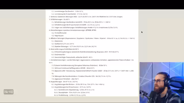 01:22:44Der Streamer beschreibt seine persönlichen Herausforderungen mit ADHS im Alltag, wie den Drang, ständig an mehrere Projekte zu denken, und die Angst, etwas zu vergessen. Er erwähnt das Konzept des Autistischen Burnouts und die Überlegung, Medikamente einzunehmen, warnt aber vor möglichen Nebenwirkungen. Er spricht auch über die individuellen Ausprägungen von ADHS, von nach außen sichtbarer Hyperaktivität bis hin zu innerlicher Unruhe und verträumtem Verhalten, insbesondere bei Frauen.
