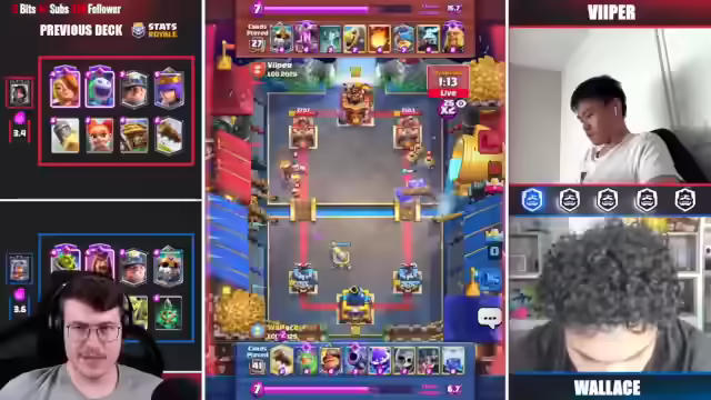 01:09:30In einer intensiven Clash Royale-Partie analysieren die Kommentatoren die Spielzüge von Wallace und Vitor. Wallace's präzises Lightning-Cycling und der Einsatz des Evo-Teslas erweisen sich als entscheidend, um Vitors Angriffe abzuwehren. Besonders hervorgehoben wird Wallace's Fähigkeit, den Tesla optimal zu platzieren und im richtigen Moment zu zünden. Vitor hingegen versucht, mit einem E-Giant-Push das Spiel zu drehen, scheitert aber an der effektiven Verteidigung von Wallace. Die Kommentatoren loben Wallace für seine strategische Meisterleistung und seinen Einzug ins Upper Bracket Finale gegen Hugo oder Viper. Sie erwähnen auch, dass Hugo überraschend stark gespielt hat und eine sogenannte Cinderella-Story schreiben könnte, wenn er sich für die World Finals qualifiziert. Es wird auch auf die Community Flash Transqualifier hingewiesen, in der Viper, ein langjähriger Freund, teilnimmt. Ehemalige französische Top-Spieler wie Donkey Kong, Lupangi und Dobermann werden erwähnt, und die aktuelle Stärke von Hugo und Viper im kompetitiven Clash Royale hervorgehoben. Loy war übrigens nie bei Worlds.
