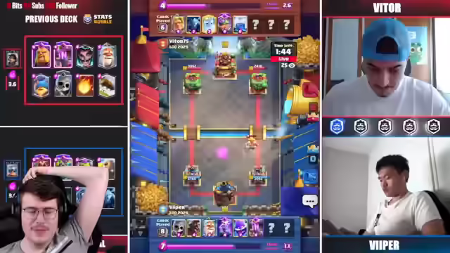 04:06:24Vitor gewinnt das dritte Spiel, wodurch er mit 2:1 in Führung geht. Viper ist mental angeschlagen. Vitor wählt ein Deck mit Evo-Fledermäusen und Kanone, während Viper mit einer Queen-Variante kontert. Viper ist mental raus und wird direkt bestraft. Viper fehlt und das wird direkt bestraft. Vitor gewinnt das vierte Spiel und gleicht zum 2:2 aus. Das fünfte Spiel entscheidet über den Einzug in die World Finals. Viper wählt den Koch, während Vitor mit einem Valkyrie- und Drill-Deck kontert. Viper ist nur noch ein Spiel von den World Finals entfernt. Viper war 10, 20 Sekunden entfernt von den World Finals, jetzt sind es wieder drei Spiele. Das ist ein geisteskrankes Best of Five. Viper war kurz vor dem Ziel, doch Vitor kontert mit einem starken Spiel und einem guten Deck-Pick. Viper macht kleine Fehler und Vitor nutzt einen A-Start für sich.