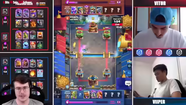 01:32:50Die Kommentatoren beobachten das Spiel zwischen Hugo und Viper, wobei Viper ein Queen Archer Deck mit Lightning einsetzt. Hugo kontert mit einem Baby Dragon und versucht, schnell zu preschen, aber Viper verteidigt geschickt mit Tesla und Valkyrie. Viper gelingt es, Hugos Angriffe abzuwehren und mit einem Miner Control Deck die Oberhand zu gewinnen. Die Kommentatoren loben Vipers perfekte Miner Defense und seine Fähigkeit, den Gegner unter Druck zu setzen. Viper gewinnt das Spiel und zieht ins Upper Bracket Finale gegen Wallace ein. Die Kommentatoren analysieren das Piggy Stack Deck, das sich als sehr stark erweist. Sie erwähnen auch, dass Miner Control Decks oft verlieren, außer das Miner Dark Prince Stack mit Tesla. Die Kommentatoren freuen sich darüber, dass Viper und Wallace, die sie zuvor gecrawlt haben, beide im Upper-Bracket-Finale stehen. Sie diskutieren Vitors Match gegen Clown im Lower Bracket und analysieren Clowns gechillte Art. Vitor setzt auf einen aggressiven Loon-Angriff, der funktioniert und Clown überrascht. Die Kommentatoren diskutieren Clowns defensive Strategie und seine Schwierigkeiten, gegen Hock zu kontern. Vitor gewinnt das erste Spiel mit einem Lavaloon Lightning Deck.