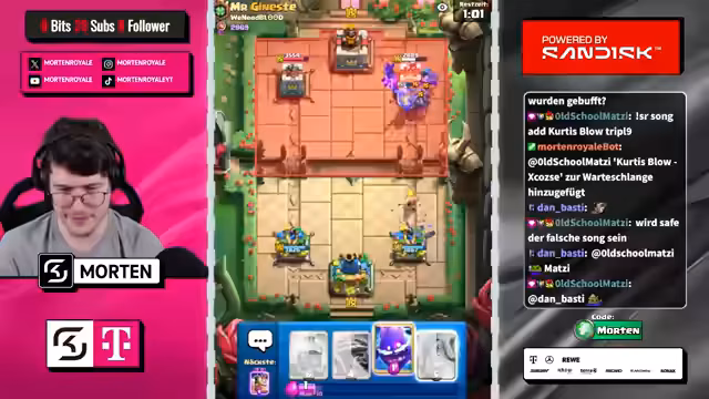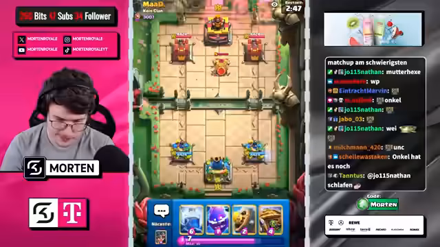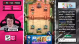 00:12:02Der Streamer dokumentiert die extrem schwierigen Matches, die er gegen sehr starke Gegner bestreitet. Viele Matches enden knapp und unglücklich, oft aufgrund von technischen Problemen oder extremen Hard-Counters. Er beschreibt, wie er trotz guter Verteidigung und teilweise guter Starts Spiele verliert, weil der Schaden des Gegners zu hoch ist oder er durch Meta-Decks wie 'Evo Knight / Evo Bomber' ausgebremst wird.