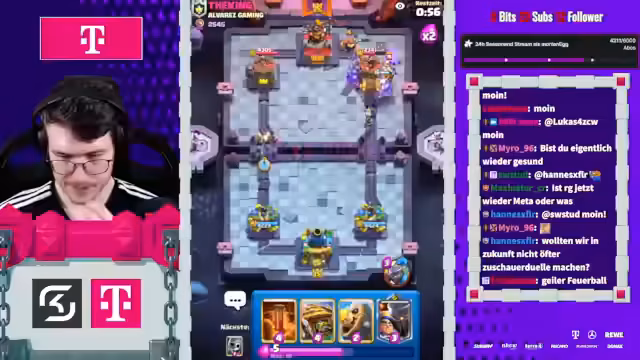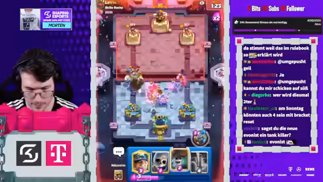 00:06:33Zu Beginn des Streams wird sofort das Gameplay gestartet. Der Streamer erwähnt sein Ziel, auf Platz 1 der Weltrangliste zu kommen und farmen zu wollen. Es wird bereits über die Meta diskutiert, insbesondere über die Evo-Karte Ghost, die als sehr stark gilt. Der Streamer vermutet, dass durch die neue Evo-Karte andere Karten wie Pekka Ritscher möglicherweise mehr gespielt werden könnten. Es folgt der erste Game-Beginn.