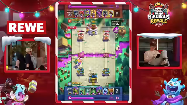 01:51:35Das REWE NIKOLAUS ROYALE CREATOR BATTLE startet mit einer dynamischen Runde im Clash Royale. Die Streamer wählen zufällige Decks und analysieren ihre Synergien und Schwächen. Ein zentrales Thema ist die Stärke der Lightning-Karte, die ein Spieler durchgängig nutzt, während ein anderer ein perfektes Deck als unwahrscheinlich bezeichnet, da der X-Bogen als nicht optimale Wahl kritisiert wird. Die Diskussionen sind geprägt von fachlichem Input zur Kartenauswahl und deren potenziellem Erfolg im anstehenden Match-up.