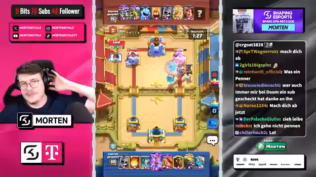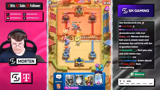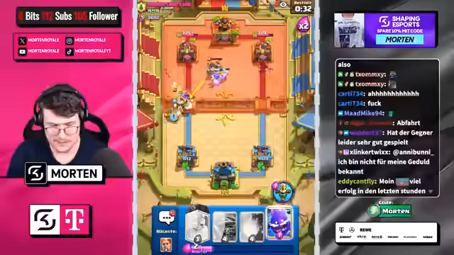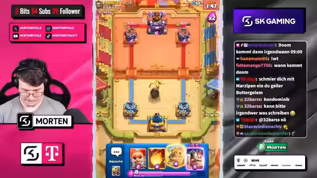 07:40:49Der Fokus liegt auf der Analyse spezifischer Matchups und den damit verbundenen strategischen Entscheidungen. Der Streamer beschreibt ein Spiel, in dem sein Gegner einen Feuerball auf seinen Königstürmer gespielt hat, was zu einem chaotischen Spielverlauf führte. Er drückte seine Frustration über den Gegner aus, der durch Brückenspam mit Feuerbällen und Grabsteinen einen erheblichen Druck erzeugt. Auch die eigene Losing Streak und der daraus resultierende Frust sind ein wiederkehrendes Thema, besonders gegen bestimmte Gegner, gegen die er scheinbar kein Gegenmittel findet.