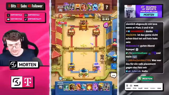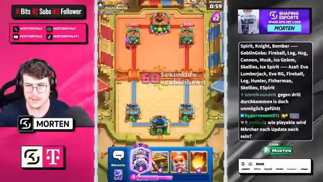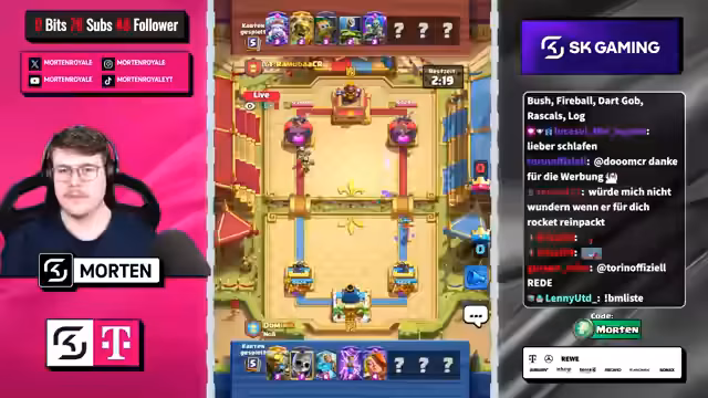 02:19:13Der Fokus verlagert sich auf das Gameplay von Clash Royale. Der Streamer plant einen sehr langen Stream, der bis 11 Uhr morgens dauern soll, was er als harten Grind bezeichnet. Er analysiert verschiedene Decks und Match-ups, wobei er insbesondere das Magic-Archer-Deck als sehr stark und nervig empfindet. Es werden spezifische Strategien, Zyklen und Verteidigungsmöglichkeiten wie der Einsatz von Spear Golems und Evo-Kanonen besprochen, um gegen bestimmte Gegner wie Golem oder Hog Rider erfolgreich zu sein.