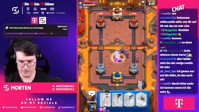 03:55:08Der Streamer testet nun ein weiteres Deck von einem namens Ian77, das aus Evo Exi, Goblin Barrel und einer alten Furnace-Variante besteht. Die Spielstrategie konzentriert sich auf den Clone und den Goblin Barrel. Trotz einem schlechten Start wird versucht, das Spiel durch gezielten Schaden und den Einsatz einer Rocket zu gewinnen. Der Gegner kann jedoch mit einer Poison-Karte antworten, was das Spiel beendet.