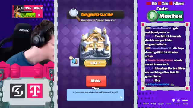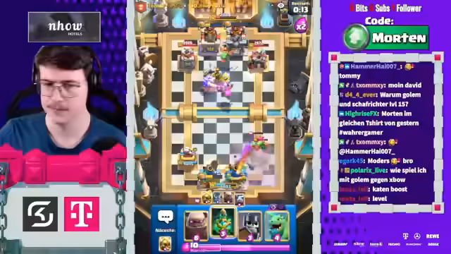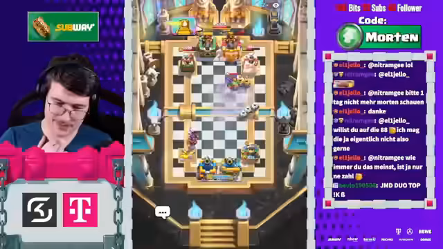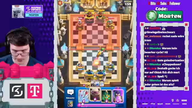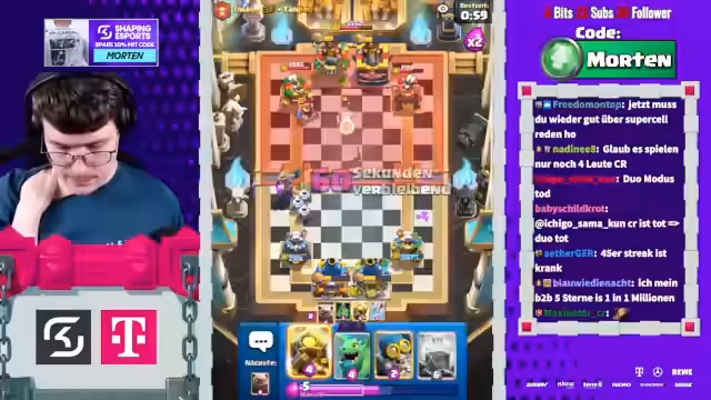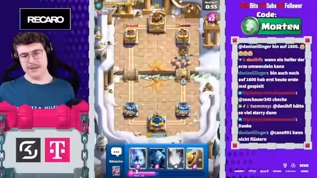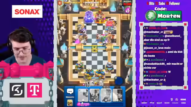 00:03:21Der Stream beginnt mit der Ankündigung, dass Mortenroyale heute mit Sam Hörpusch im Discord ist, um Clash Royale im 2v2-Modus zu spielen. Es wird erwähnt, dass Sam bereits im Discord ist und die Zuschauer aufgefordert werden, ihn zu begrüßen. Die Stimmung ist locker und humorvoll, mit gelegentlichen Scherzen zwischen den Spielern und dem Chat. Die ersten Matches beginnen, und es wird schnell klar, dass das Team sich noch einspielen muss, da das erste Spiel verloren geht. Trotzdem bleibt die Motivation hoch, und es wird über Strategien wie Golem- und Baby Dragon-Platzierungen diskutiert, um die Oberhand zu gewinnen. Die Spieler analysieren ihre Decks und die der Gegner, um die besten Züge zu finden und sich an die Spielweise anzupassen. Die Herausforderung, gegen überlevelte Gegner zu bestehen, wird thematisiert, und es wird versucht, durch präzise Lightning-Einsätze und gut getimte Verteidigungen Vorteile zu erzielen.