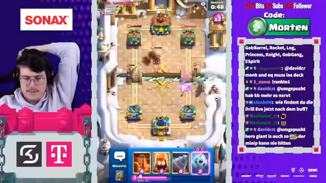 07:43:59Als Reaktion auf die aktuelle Meta schlägt der Streamer Nerfs für verschiedene Karten vor, darunter Bola, Minions und möglicherweise Giant. Die Splash-Karte wird als "stupide" kritisiert. Der Fokus liegt weiterhin auf starken Karten wie Sparky im Vergleich zu den Heroes. Währenddessen interagiert der Streamer mit Zuschauern wie Hannes und Kenny Loggins, wobei teils unverständliche oder fragmentierte Kommentare den Stream unterbrechen.