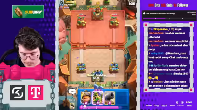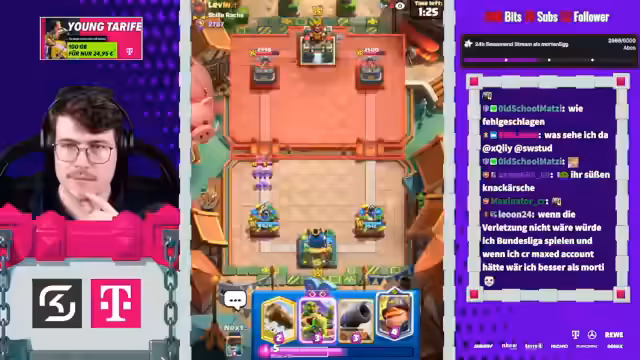 03:36:41Der Streamer erlebt einen schwierigen Start in ein Matchup und äußert seine Frustration über die scheinbar unendliche Elixier-Ressource des Gegners. Die Notwendigkeit, eine Kanone zu platzieren, wird als nervig empfunden, da sie die eigenen Ressourcen stark beansprucht. Die Diskussion über die Effektivität von Rocket Cycle und die Forderung nach einem Nerf dieser Strategie spiegeln die Anspannung im Spiel wider. Die konstante Bedrohung durch die Rakete des Gegners und die Schwierigkeit, diese zu verteidigen, führen zu einer angespannten Atmosphäre. Die Analyse der Spielzüge des Gegners und die Suche nach Wegen, den Schaden zu minimieren, sind zentrale Themen in diesem Abschnitt.