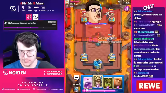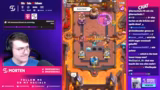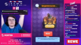 00:42:19Ein Zuschauer wird zur 100-Euro-Herausforder aufgefordert, fünf Spiele zu gewinnen. Der Streamer wechselt anschließend das Deck und setzt auf 'Evo-Ofen'. Er spricht darüber, dass die Karte den Golem stark countern kann. Zudem erwähnt er die nahende Clash Royale Liga (CL) und überlegt, ob er vorher schlafen gehen sollte, um für das Turnier ausgeruht zu sein.