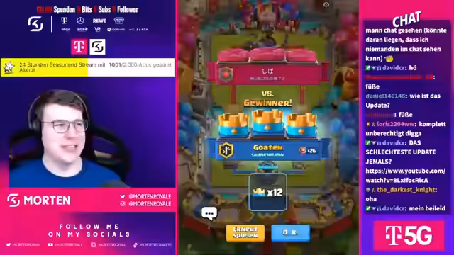 04:11:14Es wird die Freude über das Erreichen der Top 50 hervorgehoben und die erfolgreiche Aufholjagd von 3.000 auf 3.400 Trophäen im Stream betont. Dies wird als erfolgreicher Stream bewertet. Es wird die Bedeutung eines guten Chats und des Pushens im Spiel hervorgehoben. Es wird humorvoll auf frühere Misserfolge eingegangen und betont, dass man im Erfolgsfall als bester Spieler der Welt gilt, während man bei Niederlagen schnell als gescheitert abgestempelt wird. Es wird angekündigt, dass am Sonntag ein fetter Stream stattfinden wird und an einem Tag eventuell noch Feuer live gehen wird. Es wird sich bei den Zuschauern für den Support bedankt und ein Raid auf Wagnerrock angekündigt.