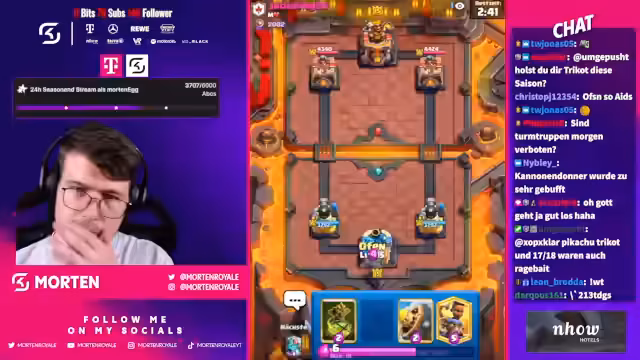 06:06:02Neben den Brawls gibt es Anekdoten aus dem Leben. Er erwähnt, dass er mit der linken Hand auf einem iPad spielt und einen Ständer verwendet. Der Streamer spricht auch über seine persönliche Fitness, indem er sagt 'ich bin am ölen'. Im Chat wird eine Frage über ein spezifisches Deck 'Moleide' aufgeworfen, auf die er eingeht.