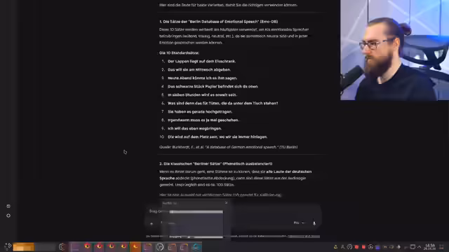 00:21:02Um die Stimme zu klonen, wird eine Aufnahme der eigenen Stimme benötigt. Der Streamer nutzt hierfür das Tool Audacity, um die spezifischen Berliner Sätze einzusprechen, die für den Klonungsprozess benötigt werden. Die Aufnahme erfolgt nach anfänglichen technischen Schwierigkeiten, bei denen das Mikro nicht korrekt ausgewählt war. Die entstandene Audiodatei dient als Referenz für das Klonungsmodell und wird auf ihre Qualität überprüft.