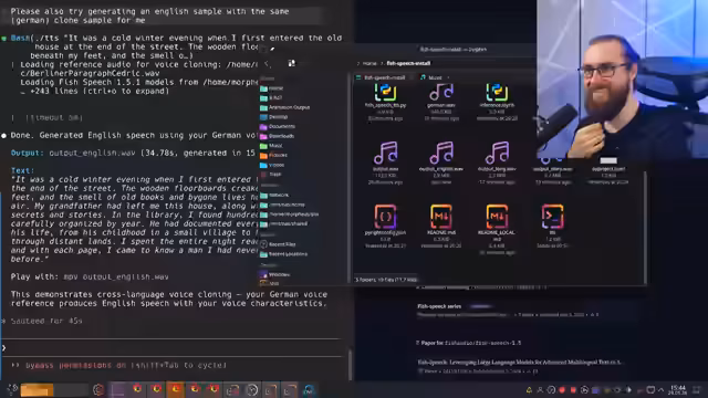 00:45:02Nachdem die Referenzaufnahme bereitsteht, wird der Prozess des Stimmenklonings mit dem Fisch Speech-Modell eingeleitet. Der Streamer nutzt ein von Claude generiertes Skript, um die Aufnahme mit dem Modell zu verknüpfen und einen Text in deutscher Sprache mit der geklonten Stimme zu generieren. Der Prozess läuft effizient lokal ab und benötigt nur einen geringen Teil der Grafikkarten-Ressourcen, während die Qualität des generierten Sprachausgangs als sehr ähnlich zur Originalstimme bewertet wird.