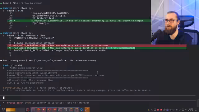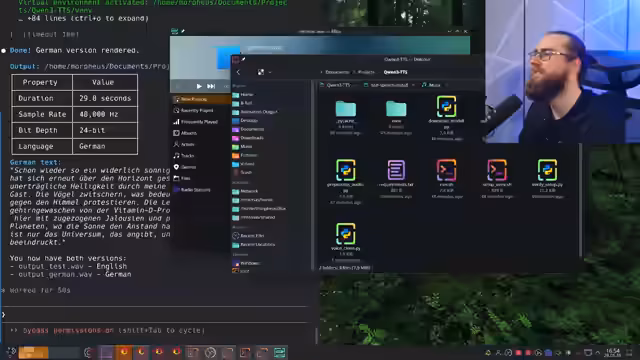 02:05:12Nach einer längeren Vorbereitungsphase startet der Streamer mit dem Test des Quen3 TTS Modells. Nach einigen technischen Herausforderungen mit der Geschwindigkeit der Sprachausgabe wird die Qualität deutlich besser, als er den Text langsamer und entspannter vorspricht. Der Streamer vergleicht das Ergebnis mit früheren Versuchen und stellt fest, dass die Qualität der generierten Audio-Datei sich massiv verbessert hat und nun deutlich natürlicher klingt, wenngleich noch leichte Artefakte vorhanden sind. Der Prozess demonstriert die praktische Anwendung und die schrittweise Optimierung der Technologie live.