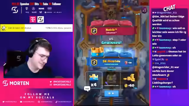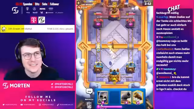 02:56:40Der Streamer reagiert auf spöttische Kommentare im Chat, die seine Fähigkeiten infrage stellen. Eine Person sagt, er schaffe es nicht auf Platz 1, und der Streamer kontert mit einer Wette, dass er in die Top 1000 komme, wobei er sich auf Lukas und andere als Konkurrenten bezieht. Es geht um Match-ups gegen Pekka, bei denen er das Gefühl hat, ein Free-Win zu haben. Er beschreibt seine Strategie, erwähnt aber auch die Frustration über scheinbar ungerechte Spielsituationen und denkt über die Dominanz von E-Golem-Decks nach, die er als No-Skill ansieht.