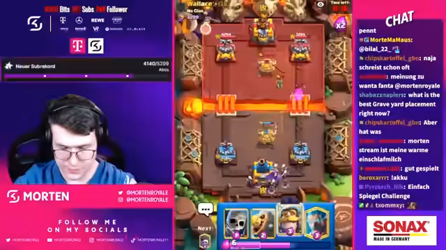 00:03:01Zu Beginn des Streams gibt es ein turbulantes Spiel. Der Streamer bemerkt einen überraschenden Angriff durch Brokkolis auf einen Gegner, der dessen Mörser-Kombination unterbricht. Obwohl die Situation unübersichtlich scheint und der Streamer kurzzeitig aus dem Gleichgewicht gerät, werden die anfänglichen Verluste schnell kompensiert und die Karte "Holz" wird präsentiert, was auf eine erfolgreiche Konsolidation hindeutet.