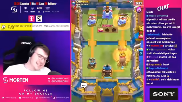 01:57:00Der Streamer freut sich über einen Gewinn von "Plus 44". Es wird gegen den "Goat" und "Lord" gespielt. Es wird überlegt, ob ein "Miner" eingesetzt werden soll. Der Streamer kommentiert, dass der Gegner "Feuerball" hat. Es folgt eine Analyse der Spielweise des Gegners, der zufällige "Giant Prints" an die Brücke setzt und damit fast den ganzen Turm einnimmt. Der Streamer bezeichnet dies als Skandal. Es wird die Frage aufgeworfen, wie man sich am besten gegen bestimmte Angriffe verteidigt. Der Streamer sieht keinen Grund, nicht aggressiv zu "poisonen". Es wird über Matchups diskutiert und die Nervigkeit von "Gromba", "Kobolden" und "Minions" hervorgehoben. Der Streamer lobt einen Gegner für sein gutes Spiel und gesteht ein, dass dieser gut gespielt hat.