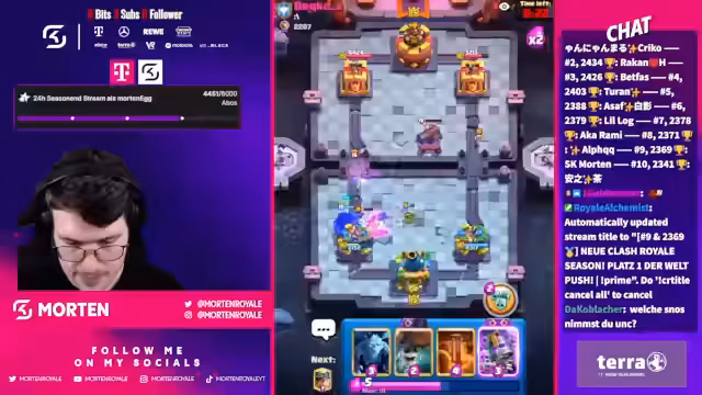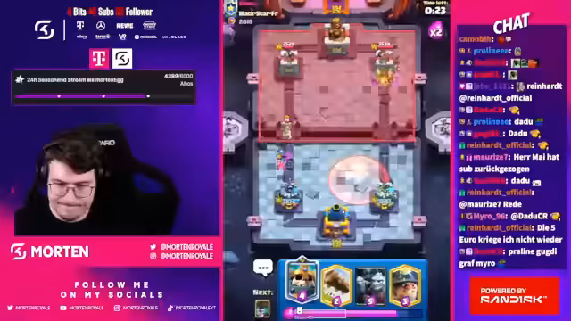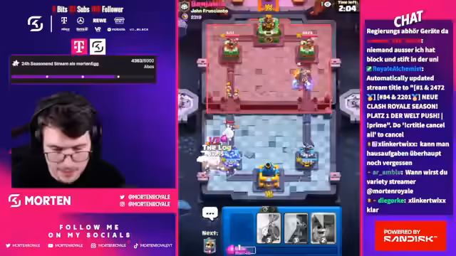 00:03:07Der Stream beginnt mit der neuen Clash Royale Season und dem Ziel, Platz 1 der Welt zu erreichen. Es wird über einen schwierigen Start gesprochen, bei dem bereits zu viel Schaden genommen wurde. Ein frühes Pech im Match-up verhinderte den Durchbruch, was zu einem Frustmoment mit dem falschen Namen im Chat führte, da der Streamer Morten und nicht Bernd ist.