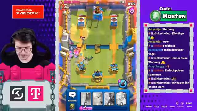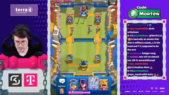 05:10:43Die Spielstrategie wird weiter vertieft. Ein Gegner, der eine Rakete pickt, wird als 'Clash Royale Mastermind' bezeichnet, aber auch kritisiert, da die fehlende Defense-Chance hinterfragt wird. Es werden humoristische Kommentare abgegeben, wie 'Heilige Scheiße' und 'Miessehörlse', um die unterdurchschnittliche Leistung der Gegner zu kommentieren. Der Chat wird aufgefordert, 'chopt' zu sein und das Spiel zu packen.
