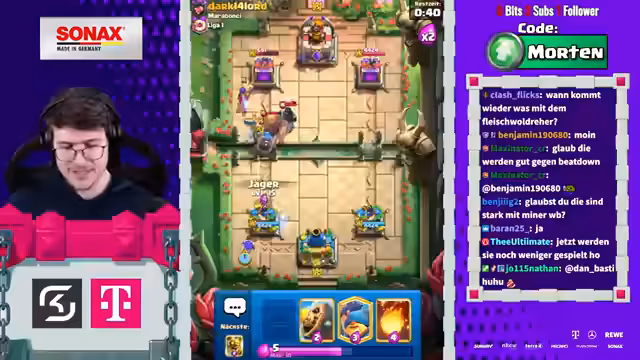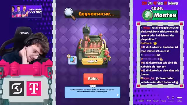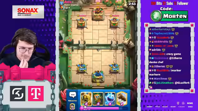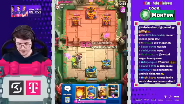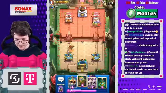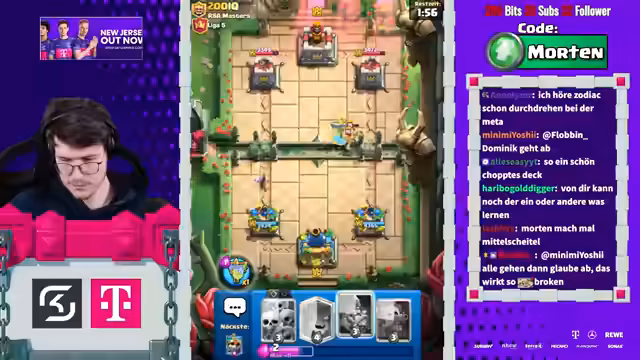 00:16:54Der Streamer ruft die Zuschauer auf, den Stream auf YouTube zu liken und dort ein Mitgliedschaft für 1,99€ im Monat abzuschließen, um ihn zu unterstützen. Gleichzeitig wird der Pass von Clash Royale mit dem Creator-Code „Morten“ beworben. Im weiteren Verlauf des Streams wird die allgemeine Richtung des Spiels kritisiert, die zu sehr in Richtung „Spam“ und „Brainrot“ geht, was die Komplexität und das Spielerlebnis negativ beeinflusst. Auch der Clan-Chat wird als tot angesehen.