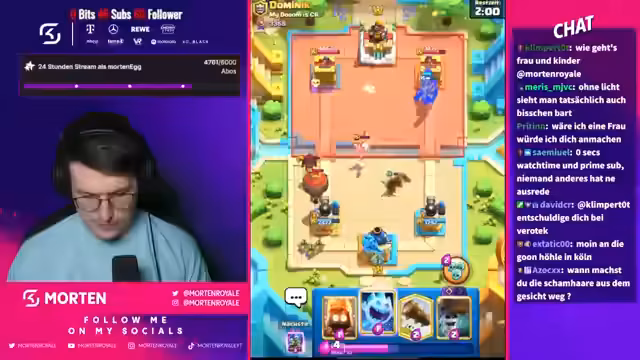 03:54:03Der Streamer berichtet von einer frustrierenden Niederlage in einemMatch, das er unbedingt hätte gewinnen müssen. Er lobt den Gegner jedoch für seine abgezockte und clevere Spielweise, insbesondere mit Pekka am Ende. Trotz der emotionalen Enttäuschung erkennt er die hohe Qualität des gegnerischen Spielzugs an und zeigt Respekt für die Leistung.