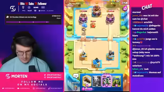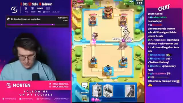01:17:15Das Geschehen verlagert sich auf das aktuelle Gameplay. Der Streamer berichtet von einem unbelohnten Fehltritt im Spiel, bei dem er sein Deck nicht zeigt und Fehler bei der Einsetzung der Einheiten eingeräumt hat. Es gibt zudem technische Erörterungen über die Streaming-Setup-Qualität und die physische Distanz zum zweiten Streamer, David, was die Kommunikation beeinflusst.