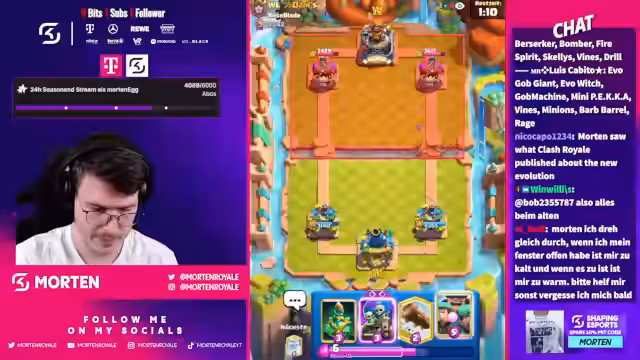 00:02:58Der Streamer beginnt mit dem Leather-Push und befindet sich auf Platz 4, der Ziel ist Platz 1. Es werden scouting-Aktivitäten erwähnt und erste Kartendecks wie Loon Cycle und Gucci Gang gespielt. Während des Spiels kommt es zu Fehlern und schlechten Spielzügen, was zu einem Verlust von Trophäen führt. Das Matchup wird als schwierig beschrieben, besonders gegen Decks mit Ghost und Evo-Kanone, die als 'broken' eingestuft werden.
