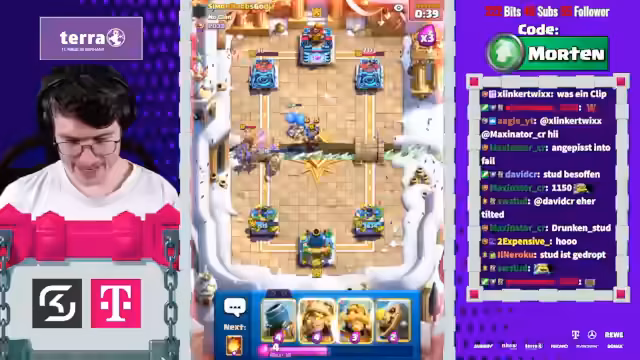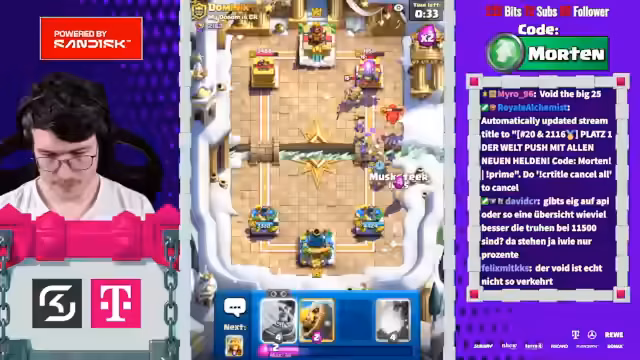 05:24:50Der Streamer verkündet euphorisch, dass er Platz 1 der Welt erreicht hat, und bedankt sich bei seiner Community. Er hebt hervor, dass dies mit dem 'massiven Deck' aus Hero Mask und Hero Knight gelungen ist. Er fordert seine YouTube-Zuschauer auf, Likes zu hinterlassen und den Code 'Morten' zu verwenden, wenn sie Angebote im Spiel nutzen. Dies ist eine direkte Aufforderung zur Unterstützung und zur Stärkung seiner Marke. Er kündigt eine kurze Pause an, um auf Toilette zu gehen und Kuchen zu holen, bevor er weiter 'Goat' pushen wird, was die Feier des Erfolgs und die Fortsetzung des Streams markiert. Die Interaktion mit VIPs und Mods zeigt die Wertschätzung für seine treuesten Unterstützer.