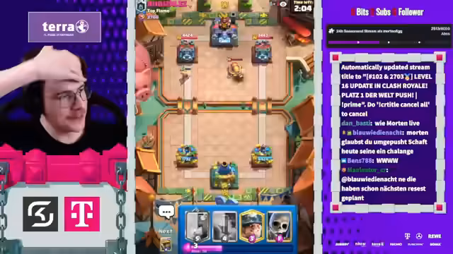 00:16:32Der Streamer zeigt sich frustriert über bestimmte Karten in der Meta und die Gegner, die diese spielen. Nach einem Comeback, bei dem er den Gegner mit einem Rocket-Spell eliminierte, witzelte er, dass die Raketen jetzt in seinen Arsch fliegen würden. Er beklagte sich, dass er gegen einen Royal Giant mit Tesla-Karten konfrontiert ist und dies als skandalös empfand. Er beschrieb das Gefühl, in dem Match-Up keinen Damage erzielen zu können und sich nur auf das Verteidigen zu konzentrieren.