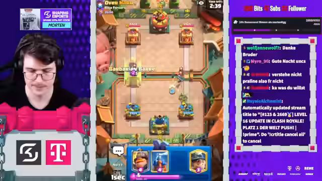 00:05:21Der Streamer kritisiert die aktuelle Meta und diskutiert im Chat mit dem Zuschauer Digi über die stärksten Karten im Spiel. Er erwähnt als sehr abgezeichnete Karten den Fan, Verus, Remi-Elixir und die Magic Archer. Nach einer längeren Diskussion über Ein-Tricks und den besten Finisher im Spiel, äußert der Streamer das Gefühl, dass er an diesem Tag einen gezielten Push auf Platz 1 der Welt machen wird. Er ist mental fokussiert und plant, den Tag ohne Fehler zu bestreiten.