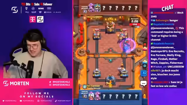 01:08:14Der Streamer spielt eine Reihe von herausfordernden Spielen gegen Gegner wie "Mohammed" und "Digi". Ein zentrales Thema ist der "Evo-Ofen", der als sehr mächtig angesehen wird und zu einem strategischen Nachteil führt, wenn man ihn selbst nicht oder nur selten erhält. Es werden Match-ups analysiert, so gegen ein "Pekka-Gob-Giant"-Deck als großer Counter. Die Stimmung ist geprägt von Frustration über den Verlust von Platzierungen in der Top 50 und der Hoffnung auf ein Comeback.