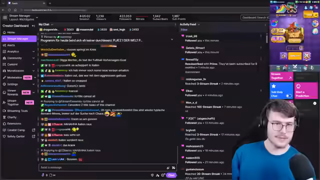 00:21:39Zwischen den Spielrunden geht der Streamer auf verschiedene Alltags-Themen ein, darunter die Karriere als Influencer und Lehrer, die aktuelle WM-Qualifikation sowie persönliche Erfahrungen. Ein wiederkehrendes Thema ist der Wunsch nach mehr Zuspruch durch die Community, insbesondere in Form von Abonnements und Spenden. Der Streamer betont seinen extremen Arbeitswillen und seine Bereitschaft, bis in die frühen Morgenstunden zu streamen, um seine Zuschauer zu unterhalten und Erfolge zu erzielen.