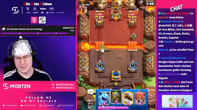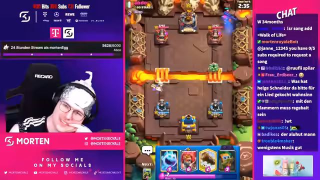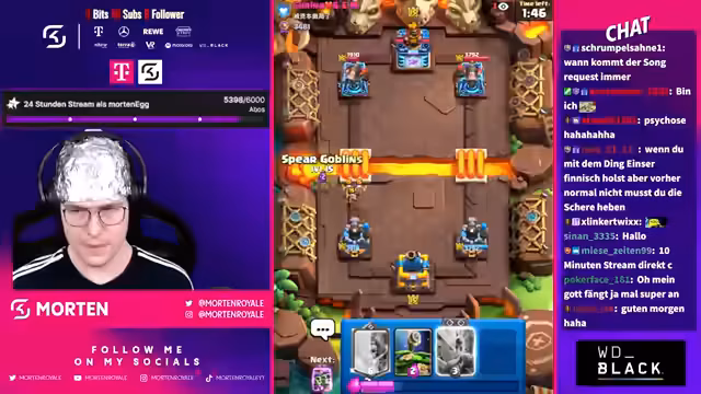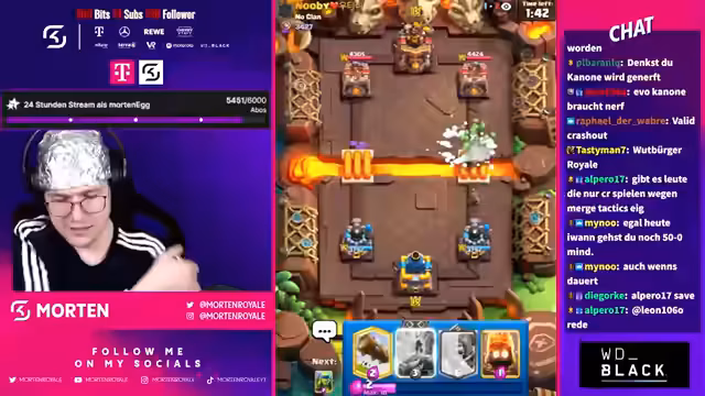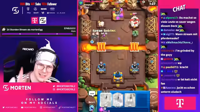 11:50:47Der Streamer analysiert sein eigenes Gameplay im Clash-Royale-Spiel. Er beschreibt den Einsatz bestimmter Decks wie 'Wallbreaker', 'Lava Hound' und den 'Morten-Bait'. Die Meta wird als 'Rage-Speed' bezeichnet. Er erwähnt Schwierigkeiten gegen bestimmte Gegner wie 'Feuerball-Range' und eine Lava-Variante. Es werden Clips für TikTok vorbereitet und Gameplay-Schwierigkeiten thematisiert.