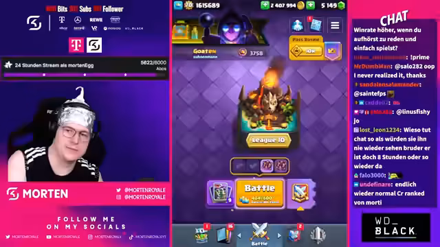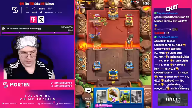 07:18:01Nach über 20 Stunden Streamzeit wird die Jagd auf Platz 1 der Welt fortgesetzt. Der Streamer analysiert das Matchup gegen den führenden Spieler, dessen Deck als sehr stark eingeschätzt wird. Gleichzeitig berichtet er von den Erfolgen seiner Team-Accounts: 'Murmel' sei Top 20 und 'Golden' knapp in den Top 50. Der Stream scheint trotz der langen Dauer und schwierigen Matchups gut zu laufen, und das Ziel, die Platz 1 zu erreichen, bleibt das Hauptmotiv.