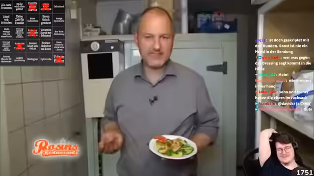00:21:14Der Streamer beschreibt seinen Besuch im Restaurant 'Gute Laune', wobei er den Zustand der Immobilie, die Küchenausstattung und die Speisekarte kritisiert. Er organisiert ein Testessen mit 25 Gästen, um die Qualität zu bewerten. Die Ergebnisse des Tests sind katastrophal, wobei alle Gerichte durchschnittlich nur drei Punkte erhalten und teilweise als 'radioaktiv verstrahlt' und 'für Hunde ungenießbar' beschrieben werden.