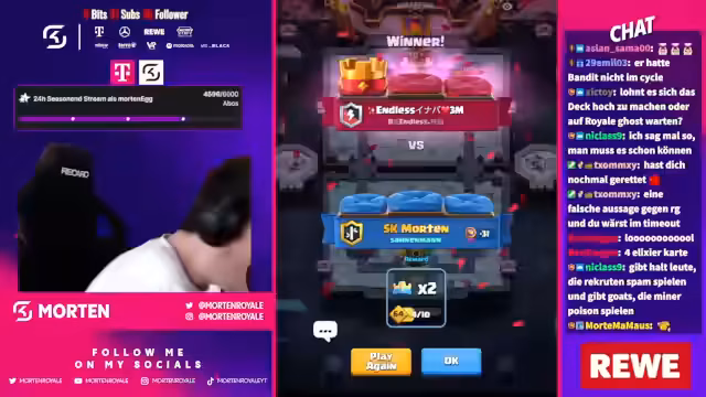00:38:23Der Stream beginnt mit intensivem Gameplay in Clash Royale, wobei die Matches als sehr herausfordernd und krachend beschrieben werden. Es geht um schwierige Matchups, bei denen der Streamer betont, dass er trotz der Herausforderungen keinen Schaden nehmen wird und ein abgezocktes Spiel durchzieht. Persönliche Kommentare über Rivalen und Nervenkitzel begleiten die Runden, während die Atmosphäre von Aufregung und taktischem Vorgehen geprägt ist, ohne dass auf externe Unterstützung eingegangen wird.