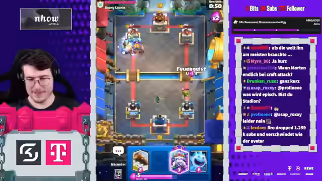 03:48:35Nach einigen Rückschlägen und Diskussionen über die Stärke der Gegner wird die Challenge erstmals mit einem günstigeren 1,6-Elixir-Deck absolviert. Stream und Chat feiern den achten Erfolg, wobei der Ghost-Karte eine besondere Trägerrolke in vielen Situationen zugeschrieben wird. Es folgt die Ankündigung, die Challenge nun mit einem 1,5-Elixir-Deck erneut zu versuchen, um den Rekord zu übertreffen.