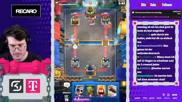 05:42:56Der Stream setzt den Fokus auf den ambitionierten Versuch, die Challenge mit dem bisher niedrigsten Elixir-Durchschnitt von 1,5 zu meistern. Nach einem anfänglichen Scheitern wird der Recordversuch nach einer kurzen Pause und einer Anpassung des Decks erneut aufgenommen. Das Team rund um Streamer und Mod "Ehrenmann" arbeitet daran, den Account für den neuen Versuch umzubenennen und vorzubereiten.