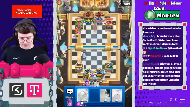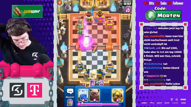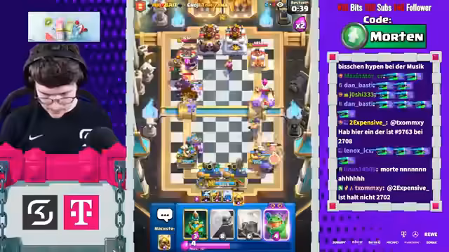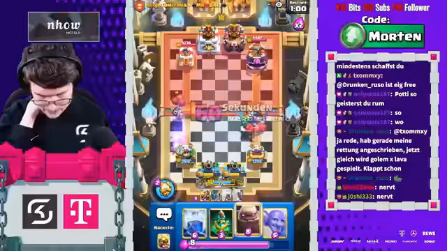 00:00:41Der Stream startet mit der Begrüßung des Chats. Es wird ein bevorstehendes YouTube-Video um 15 Uhr angekündigt, bei dem das Team Top 20 mit 2.6 Trophäen erreichte. Nach dem Start geht es direkt in die Vorbereitung für den 2vs2-Seasonend-Push. Der Streamer muss seine Karten boosten und stellt fest, dass ihm die Boosts fehlen. Daher öffnet er den Supercell Store, um Angebote zu nutzen, und kauft diverse Jokers und Wildcards für rund 60 Euro, um seine Karten wie Golem und Baby Dragon auf Level 16 zu bringen.